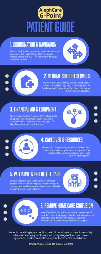 Patients receiving home healthcare in Ontario have access to a variety of resources designed to support every stage of life. If you have questions, contact AlephCare or your local health coordinator.